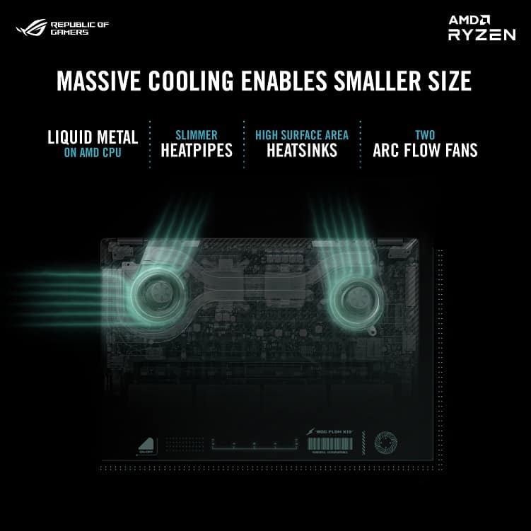 ROG Intelligent Cooling ด้วยพัดลมคู่ที่ได้รับการออกแบบใหม่ “Arc Flow Fans” ที่ใช้วัสดุแบบ Liquid Crystal Polymer (LCP) ที่มีความแข็งแกร่งมากขึ้น ทำให้สามารถลดความบางของใบพัดลงได้เหลือเพียง 0.1 มม. และเพิ่มจำนวนใบพัดให้ได้มากสูงสุดถึง 84 ใบพัด ส่งผลให้เสียงรบกวนจากการระบายความร้อนที่ลดลงแต่สามารถเพิ่มอัตราการไหลเวียนอากาศภายในได้มากขึ้น 13% นอกจากนั้นแล้ว ROG ยังได้เลือกใช้สารนำความร้อนพิเศษแบบโลหะเหลว (liquid metal) จากแบรนด์ Thermal Grizzly ที่สามารถลดความร้อนที่เกิดขึ้นจากชิพโปรเซสเซอร์ออกมายังท่อฮีทไปป์ได้ดีกว่าสารนำความร้อนทั่วไปมากสูงสุดกว่า 10 องศาเซลเซียส