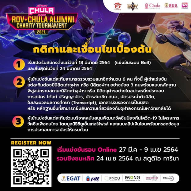* วัน เวลา และสถานที่จัดการแข่งขันอาจมีการเปลี่ยนแปลง ทีมผู้เข้าแข่งขันสามารถติดตามรายละเอียดได้ที่ Facebook เพจ Chula Alumni และ Garena RoV Tournament