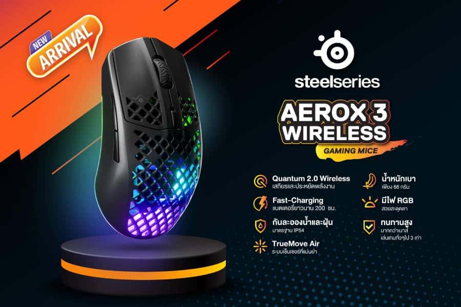 ขณะที่เมาส์ SteelSeries รุ่น Aerox3 เป็นเมาส์สำหรับเล่นเกมที่ถูกออกแบบมาให้มีน้ำหนักเบาเป็นพิเศษเพียง 57 กรัม ทำให้เพิ่มความรวดเร็วในการใช้งานได้เป็นอย่างดี ผสานการทำงานของเซ็นเซอร์ตัวใหม่ล่าสุด TrueMove Core Sensor ที่เปิดตัวครั้งแรกใน Rival3 รวมถึงเซนเซอร์แบบออพติคอลที่มีความละเอียดถึง 8,500 CPI, 300 IPS, 35G ที่ออกแบบร่วมกับ PixArt โดยเฉพาะ ทำให้ควบคุมการเคลื่อนย้ายเมาส์ได้อย่างลื่นไหล ไม่สะดุด รองรับการคลิกได้มากกว่า 80 ล้านครั้ง ในขณะที่ตัวเมาส์ยังมาพร้อมมาตรฐานการกันน้ำกันฝุ่นด้วย IP54 ขณะเดียวกันสาย USB ได้รับการผลิตขึ้นมาจากสายผ้าถัก จึงสามารถเพิ่มความทนทานในการใช้งานได้เป็นอย่างดี โดยเมาส์รุ่น Aerox3 พร้อมวางจำหน่ายแล้ววันนี้ในราคา 2,990 บาท