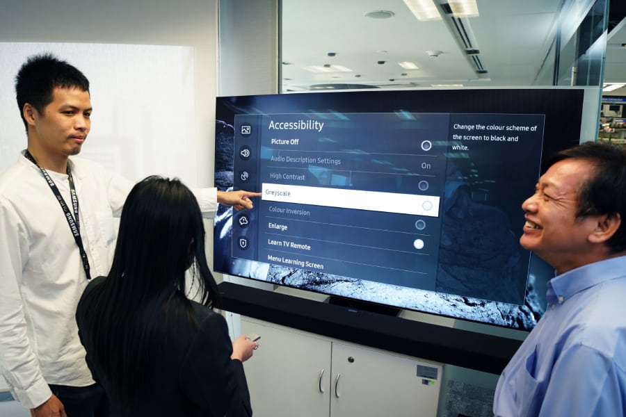 แอปพลิเคชัน SeeColors App ที่ช่วยในการปรับสีและเติมเต็มสีที่หายไป เพื่อให้ผู้พิการทางสายตาได้รับชมภาพทางทีวีได้อย่างสมบูรณ์แบบ, การบรรยายผ่านเสียง (Audio Description), การสอนการใช้งานรีโมต (Learn TV Remote), ข้อมูลเสียง (Voice Guide) และทางลัดเข้าสู่โหมดตัวช่วยการเข้าถึง (Accessibility Shortcuts) เป็นต้น ซึ่งในวันนี้เราได้ร่วมมือกับสมาคมคนตาบอดแห่งประเทศไทยเพื่อพัฒนาระบบที่จะส่งต่อผลิตภัณฑ์และการบริการที่จะช่วยเพิ่มความมั่นใจในการใช้ชีวิต รวมถึงยังช่วยให้กลุ่มผู้พิการทางสายตาได้เข้าถึงข้อมูลและการใช้งานต่างๆ เพื่อยกระดับความสะดวกสบาย เปิดประตูสู่การเรียนรู้ และเสริมสร้างโอกาสใหม่ๆ ในโลกยุคดิจิทัลที่เท่าเทียม”
