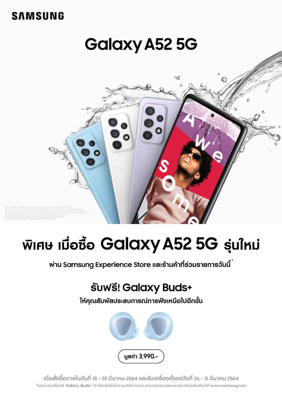 พิเศษ! สำหรับผู้ที่สั่งซื้อ Galaxy A52 5G ระหว่างวันที่ 18-25 มีนาคม 2564 รับฟรีหูฟังไร้สาย Galaxy Buds+ มูลค่า 3,990 บาท พร้อมรับเครื่องในวันที่ 26 มีนาคม – 4 เมษายน 2564 ที่ Samsung Experience Store และร้านค้าที่ร่วมรายการ หรือดูรายละเอียดเพิ่มเติมได้ที่www.samsung.com/th/smartphones/galaxy-a/