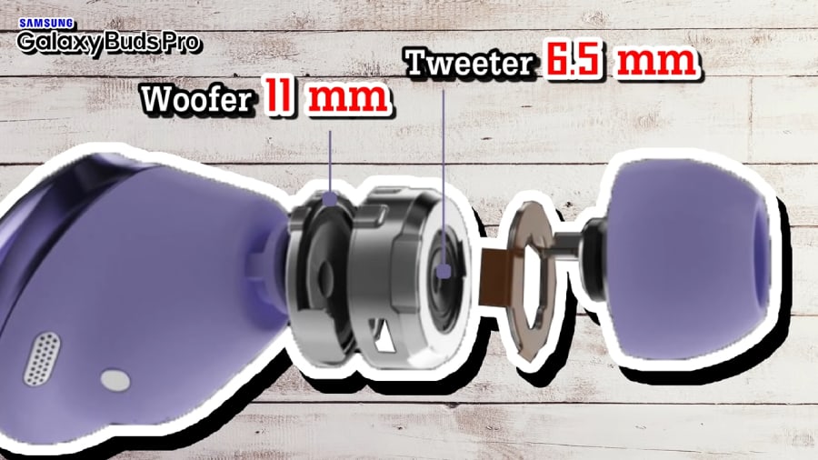 Galaxy Buds Pro เป็นหูฟังที่มี 2 Driver หูฟัง True Wireless ที่มีอยู่ในท้องตลาดตอนนี้เป็นหูฟังที่มี Driver ข้างละ 1 ตัวเท่านั้น อันนี้มีข้างละ 2 ตัว ในฝั่งหูฟังเดียวกันข้างเดียวกันจะมีทั้ง Driver ที่เป็น Woofer ขนาด 11 มิลลิเมตร แล้วก็มี Driver ที่เป็น Tweeter อีก 6.5 มิลลิเมตร อีก 1 ตัวเรียงต่อกัน เท่ากับว่าถ้าเทียบกับในวงการที่เขาเรียกเป็นเครื่องเสียงอันนี้เหมือนกับลำโพงแยกชิ้น ของเดิมที่เราเคยฟังมาทั้งหมดเป็นลำโพงแบบรวมชิ้นเวลาเราไปติดตั้งเครื่องเสียงรถยนต์ อย่างเช่นลำโพง 6×9 รวมชิ้น 3 ทาง รวมอยู่ในตัวเดียวกัน ลำโพงอันเดียวแสดงเสียงต่ำไปจนถึงความถี่สูง ฉะนั้นลำโพงแยกชิ้นต้องให้เสียงที่ดีกว่าแน่นนอน