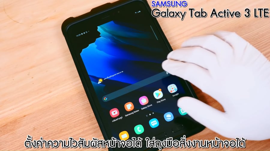 Galaxy Tab Active 3 เป็นจอที่ออกแบบมาสำหรับการทำงานอย่างแท้จริง เราทำงานอยู่อาจจะใส่ถุงมือยางถุงมือพลาสติกจะจุ้มหน้าจอ สัมผัสหน้าจอเนี่ยก็เป็นเรื่องยากใช่ไหมแต่ Galaxy Tab Active 3 ตัวนี้ ออกแบบมาให้เราสามารถตั้งค่าหน้าจอได้ว่าเพิ่มความไวในการสัมผัสหน้าจอได้ พอเป็นแบบนี้แล้วเราก็สามารถใส่ถุงมือไปด้วยทำงานไปด้วยได้เลย