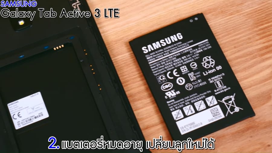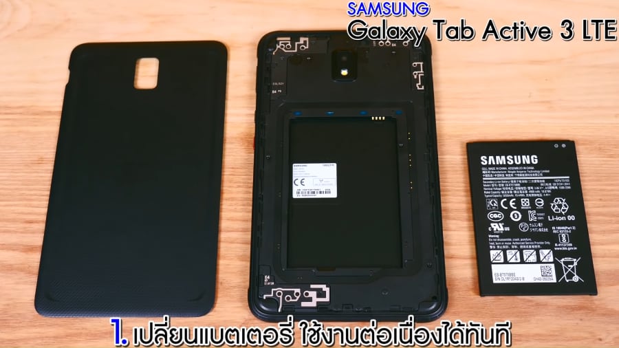 จุดเด่นของแท็บเล็ต Samsung รุ่นนี้ ก็คือที่ฝาหลังของเขาสามารถเปิดออกมาได้ ถอดฝาหลังออกมาได้แล้วแบตเตอรี่ก็สามารถถอดออกมาได้ มีประโยชน์มากๆ เลย การถอดแบตเตอรี่ได้ สามารถใช้งานได้อย่างมีประโยชน์หลายอย่าง เช่นถ้าเป็นงานที่จะต้องใช้งานแท็บเล็ตเครื่องนี้ต่อเนื่องเป็นเวลาอย่างยาวนานมากๆ แล้วไม่มีเวลาพักชาร์จแบตเลย เราก็อาจจะซื้อแบตเตอรี่สำรองไว้หลายๆ ก้อน ให้ไปเอาไว้แบตหมดถอดเปลี่ยนใหม่ใส่เข้าไปพร้อมทำงานต่อได้ทันทีทำให้เราทำงานได้ต่อเนื่อง