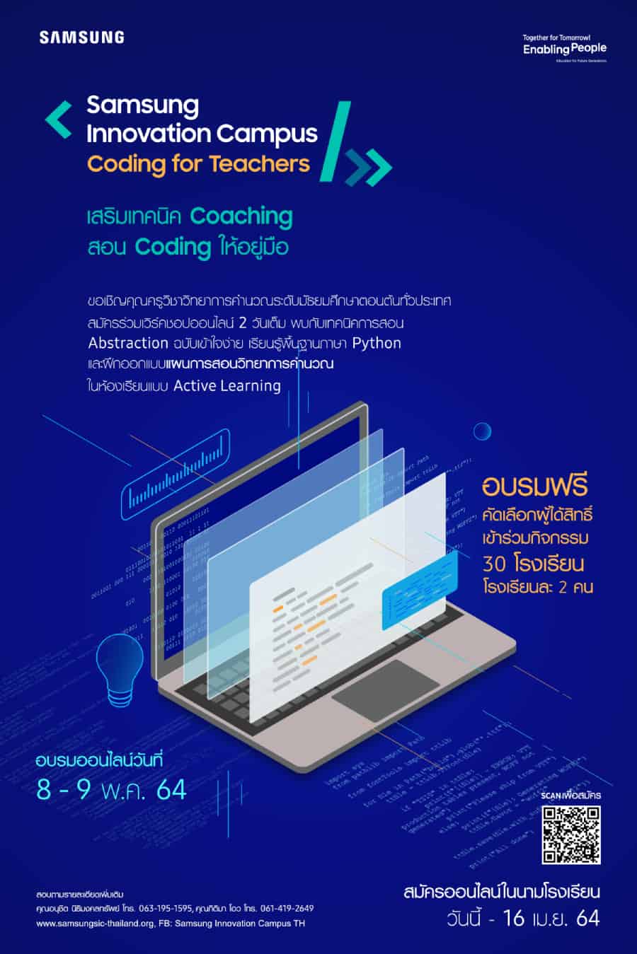 บริษัท ไทยซัมซุง อิเลคโทรนิคส์ จำกัด เชิญชวนคุณครูวิชาวิทยาการคำนวณระดับชั้นมัธยมศึกษาตอนต้นทั่วประเทศร่วมการอบรมเชิงปฏิบัติการ Samsung Innovation Campus – Coding for Teachers เสริมเทคนิค Coaching สอน Coding ให้อยู่มือ โดยคุณครูจะได้ฝึกเขียนโค้ดภาษา Python ขั้นพื้นฐานพร้อมรับเทคนิคการสอนแบบจัดเต็ม เรียนรู้แนวคิดเชิงนามธรรม (Abstraction) และเข้าใจพัฒนาการของคณิตศาสตร์และคอมพิวเตอร์ อีกทั้งยังได้ฝึกออกแบบหน่วยการเรียนรู้แบบ Active Learning