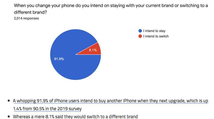 SellCell ทำการสำรวจเรื่อง loyalty หรือความภักดีและเต็มใจที่จะซื้อและใช้แบรนด์เดิมอีกครั้งจากกลุ่มตัวอย่างเป็นผู้ใช้งานสมาร์ทโฟนชาวอเมริกัน 5,000 คนเมื่อต้นเดือนมีนาคมที่ผ่านมา พบว่าความภักดีของ iPhone นั้นทำสถิติอยู่สูงถึง 91.9% ในขณะที่ความภักดีของฝั่ง Android นั้นลดลง