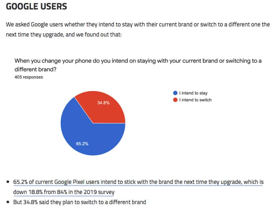 ผู้ใช้งาน Samsung มีเปอร์เซ็นต์ความภักดีที่ 74% ลดลงจากปีที่แล้วที่สำรวจได้ถึง 85.7% และดูเหมือนจะมีแต่ลดลงในแบรนด์อื่นๆ ฝั่ง Android เช่น ผู้ใช้งาน Google Pixel มีเปอร์เซ็นต์ที่ต้องการจะใช้ผลิตภัณฑ์เดิมต่อไป 65.2% ลดลงจากปีที่แล้วที่ 84% ของแบรนด์ LG อยู่ที่ 37.4% ลดลงจากปีที่แล้วที่ 61.3% และ Motorolla อยู่ที่ 29% ลดลงจากปีที่แล้วที่ 61.1%