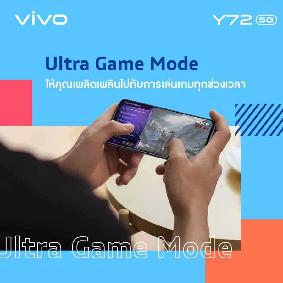 Vivo Y72 5G คือสมาร์ตโฟนรุ่นแรกใน Y Series ที่รองรับการไลฟ์สตรีมมิ่งบนเครือข่ายสัญญาณ 5G ทำงานด้วยระบบปฏิบัติการ Funtouch OS 11.1 รุ่นใหม่ ที่จะทำให้การเล่นเกมแบบเรียลไทม์ไหลลื่นยิ่งขึ้น พร้อมเติมเต็มอรรถรสให้กับเหล่าเกมเมอร์แบบเต็มขั้น ด้วย Ultra-Game Mode ที่มอบประสบการณ์การเล่นเกมแบบ 4D ที่สมจริง พร้อมโหมด E-sports ป้องกันการแจ้งเตือนข้อมูลทั้งหมดระหว่างการเล่นเกม ปรับอัตราเฟรมเรตแบบเรียลไทม์เพิ่มประสิทธิภาพเกม ให้คุณสนุกกับการเล่นเกมได้อย่างเต็มอารมณ์