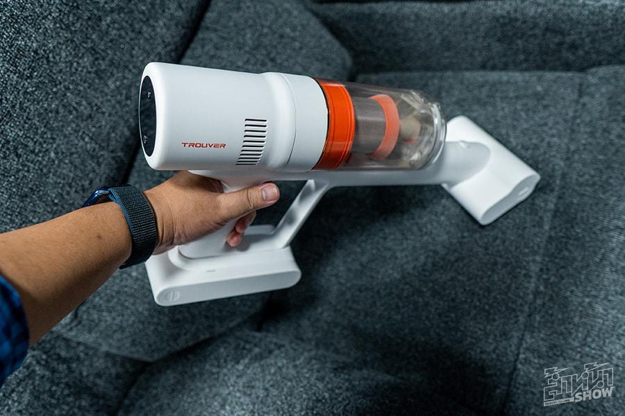ด้านบนของตัวเครื่อง จะเป็นถังเก็บฝุ่น ออกแบบมาให้โปร่งใส ทำให้เรามองเห็นปริมาณฝุ่นที่ดูดมาเก็บเอาไว้ มีปุ่มกดที่ด้านหน้าเพื่อแกะเอาถังออกไปเทฝุ่นทิ้งได้