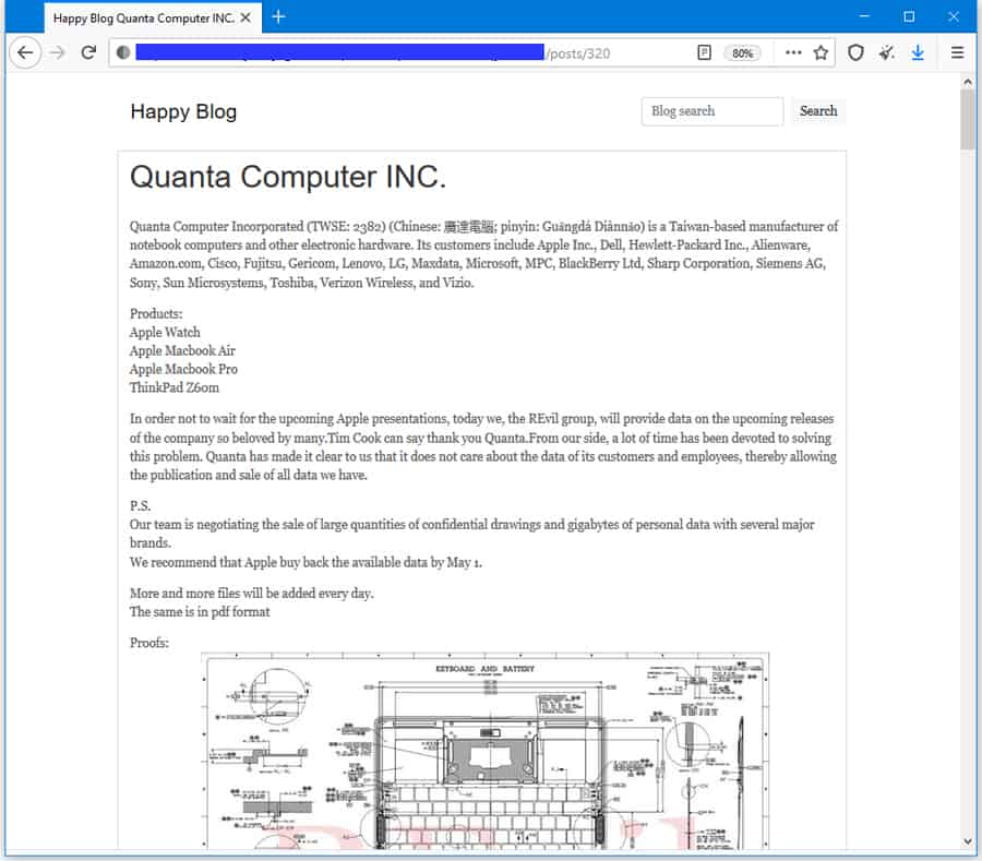 The Record รายงานเกี่ยวกับข้อมูลหลุดเป็นที่แรก โดยระบุว่าเป็นผลงานของกลุ่ม REvil กลุ่มแฮ็กเกอร์ชาวรัสเซียที่รู้จักกันในชื่อ Sodinokibi โดยแฮ็กเกอร์ได้เริ่มโพสต์ภาพที่ถูกขโมยไปเมื่อวันที่ 20 เมษายน ซึ่งเป็นกำหนดเวลาของ event งาน Spring Loaded ที่เพิ่งผ่านมาของทางบริษัท Apple หลังจาก Quanta ปฏิเสธที่จะจ่ายเงินค่าไถ่มูลค่า 50 ล้านดอลลาร์สำหรับข้อมูล ซึ่งทางแฮ็กเกอร์คาดหวังให้ Apple จ่ายเงินค่าไถ่ภายในวันที่ 1 พฤษภาคม พร้อมขู่อีกว่าจะโพสต์ภาพหลุดทุกวันจนกว่าจะจ่ายเงินค่าไถ่