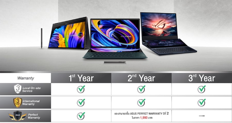 นอกจากนี้ยังอุ่นใจกับประกันอุบัติเหตุ 1 ปี กับ Perfect Warranty ดูแลผลิตภัณฑ์เมื่อเกิดความเสียหายจากอุบัติเหตุ ไม่ว่าจะเป็นความเสียหายจากน้ำหกใส่, ไฟฟ้าลัดวงจร หรือความเสียหายจากการทำเครื่องตกหล่น โดยสามารถใช้สิทธิ์ได้ 1 ครั้งในปีแรกของการรับประกัน และเอซุสจะสนับสนุน 80% ของราคาซ่อมเครื่อง** โดยเอซุสยังมอบสิทธิ์ต่ออายุประกันอุบัติเหตุเมื่อเข้าปีที่สอง เพิ่มได้อีก 1 ปี (ในราคา 1,990 บาท) ภายใต้เงื่อนไขที่กำหนด