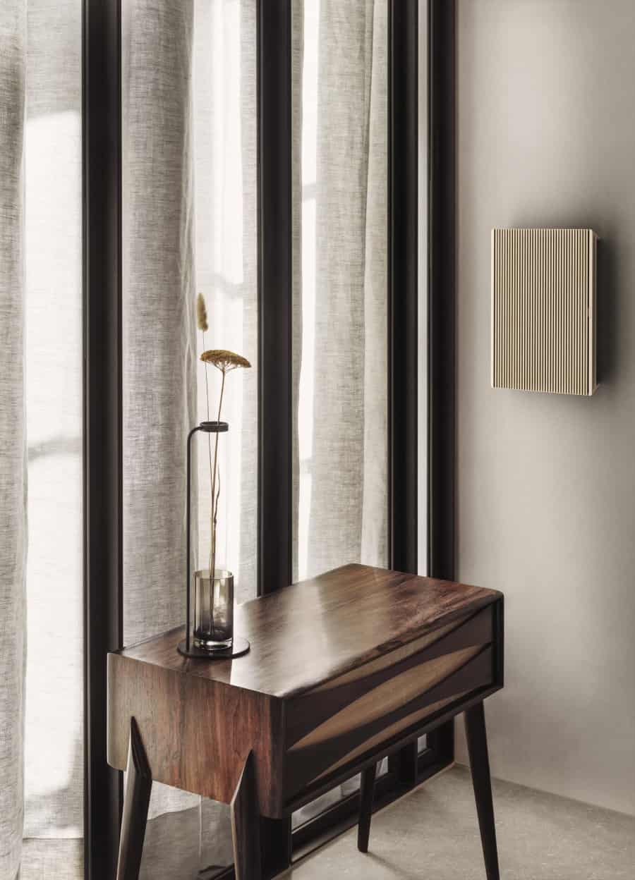 การนำเสนองานดีไซน์ที่อมตะอย่างแท้จริง ออกแบบโดย Torsten Valeur ที่ผลิตขึ้นภายใน Factory 5 ที่เมือง Struer ประเทศเดนมาร์ก Beosound Level เป็นผลิตภัณฑ์ที่แสดงถึงความเชี่ยวชาญในด้านงานผลิตอลูมิเนียมที่มีโครงอลูมิเนียมแบบ Pearl Blasted วัสดุที่ผสานความลงตัวของเทคโนโลยีและดีไซน์ สร้างความกลมกลืนให้เข้ากับงานตกแต่งภายใน หน้ากากลำโพงทำจากไม้โอ้คสีธรรมชาติ ที่ผ่านการบ่มเพาะจนมองเห็นลวดลายและผิวสัมผัสตามธรรมชาติของเนื้อไม้ ดูคล้ายกับเฟอร์นิเจอร์สุดหรูจากแถบสแกนดิเนเวีย ในส่วนของผ้าทอถักแบบไร้รอยต่อ Kvadrat สีเทาเข้มมอง ทำให้ลำโพง Beosound Level เชิญชวนให้สัมผัสและจับจ้องไม่ว่าจะจากมุมใด