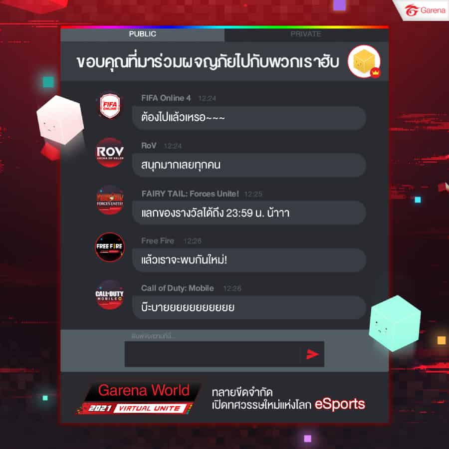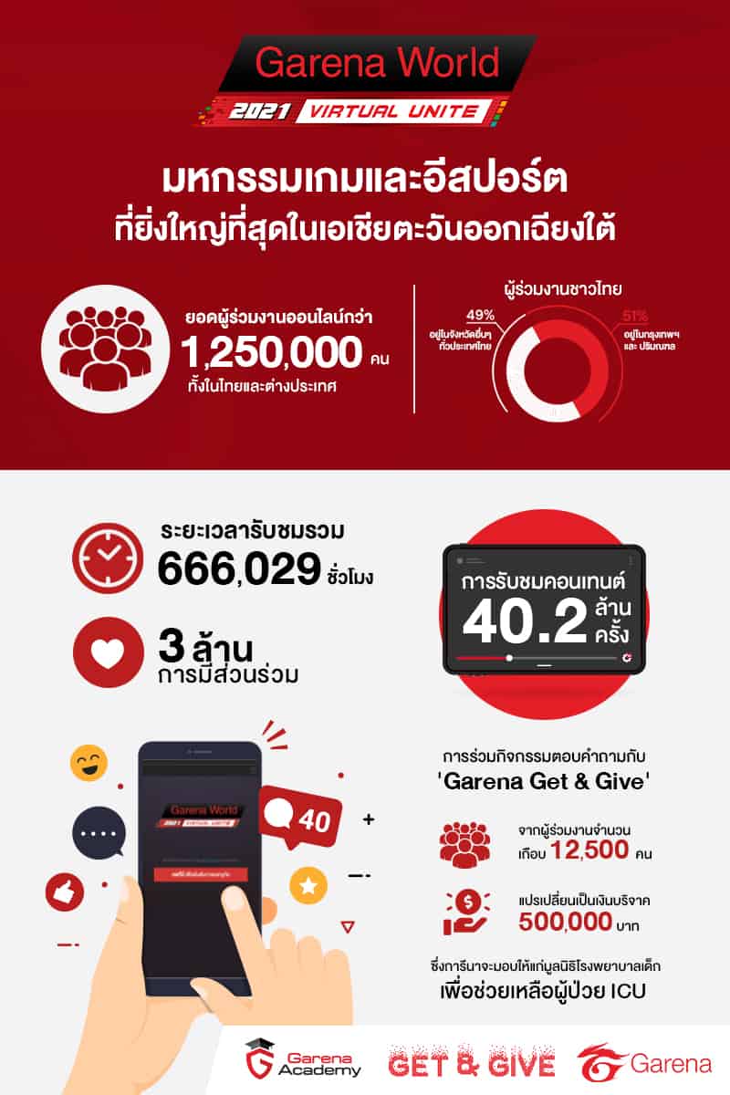 การีนา ผู้ให้บริการและผู้พัฒนาเกมออนไลน์ชั้นนำระดับโลก และผู้นำด้านการสร้างสรรค์ประสบการณ์เหนือระดับผ่านคอนเทนต์เกมและอีสปอร์ต ขอขอบคุณเกมเมอร์และแฟนอีสปอร์ตที่ให้การตอบรับเป็นอย่างดีกับ ‘Garena World 2021: Virtual Unite’ มหกรรมเกมและอีสปอร์ตที่ยิ่งใหญ่ที่สุดในเอเชียตะวันออกเฉียงใต้ซึ่งจัดขึ้นในรูปแบบ Virtual Event เป็นครั้งแรก ด้วยยอดผู้เข้าร่วมงานออนไลน์จำนวนกว่า 1,250,000 คน ทั้งจากประเทศไทยและต่างประเทศ อาทิ ประเทศในภูมิภาคเอเชียตะวันออกเฉียงใต้ ไต้หวัน จีน และเกาหลีใต้