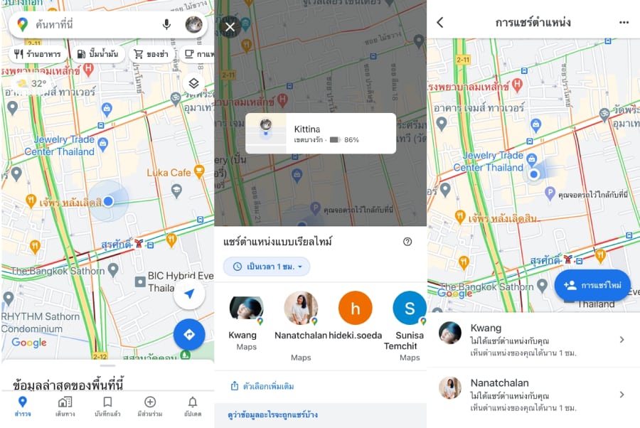 แชร์ตำแหน่งของคุณ (Share your location) – หากเดินทางไปในสถานที่ที่ไม่คุ้นเคย ไม่ต้องกังวลว่าจะหลงกับเพื่อนร่วมเดินทาง หรือครอบครัวหากขับไปคนละคัน หรือหากต้องการนัดพบระหว่างทาง เพียงแค่กดเลือกจุดสีฟ้าที่แสดงตำแหน่งปัจจุบันที่คุณอยู่ แล้วเลือกแชร์ตำแหน่งแบบเรียลไทม์ และเลือกระยะเวลาที่ต้องการแชร์ตำแหน่ง โดยสามารถเลือกแชร์ได้ตั้งแต่ 1 ชั่วโมงเป็นต้นไป หรือจนกว่าคุณจะปิดสัญญาณการแชร์