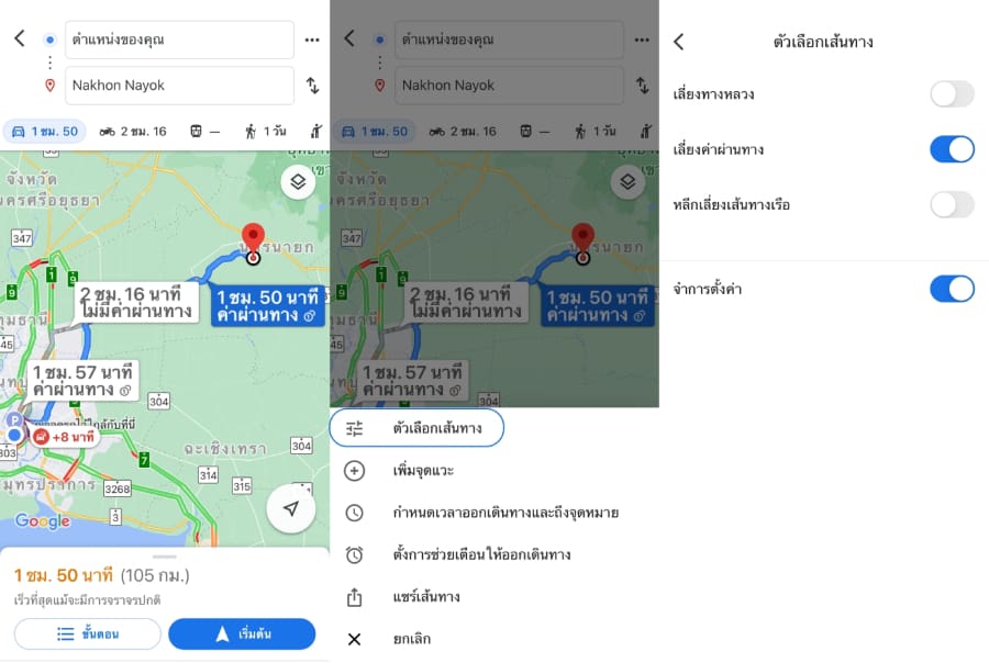 ตัวเลือกเส้นทาง (Route options) – ตัวเลือกเส้นทางเลี่ยงทางหลวง (Highways) เลี่ยงค่าผ่านทาง (Tolls) และหลีกเลี่ยงเส้นทางเรือ (Ferries) เพราะไม่ใช่ทุกการเดินทางที่จำเป็นต้องใช้ทางด่วน ดังนั้น คุณจึงสามารถเลือกเส้นทางที่เลี่ยงทางด่วนด้วยการเลือกคำสั่ง “ตัวเลือกเส้นทาง” (Route options)