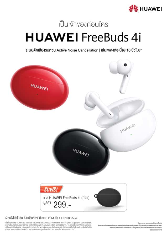 นอกจากนี้ ผู้ที่ซื้อ HUAWEI FreeBuds 4i ระหว่างวันที่ 24 มีนาคม – 4 เมษายน 2564 ยังได้รับเคส HUAWEI FreeBuds 4i CASE สีดำ มูลค่า 299 บาททันที เมื่อซื้อหูฟังที่หน้าร้าน HUAWEI Experience Store และร้านค้าตัวแทนจำหน่ายที่ร่วมรายการ รวมถึงช่องทางออนไลน์อย่าง HUAWEI Online Store, Shopee, Lazada และ JD Central ใครสนใจสามารถอ่านรายละเอียดเกี่ยวกับผลิตภัณฑ์เพิ่มเติมได้ที่นี่