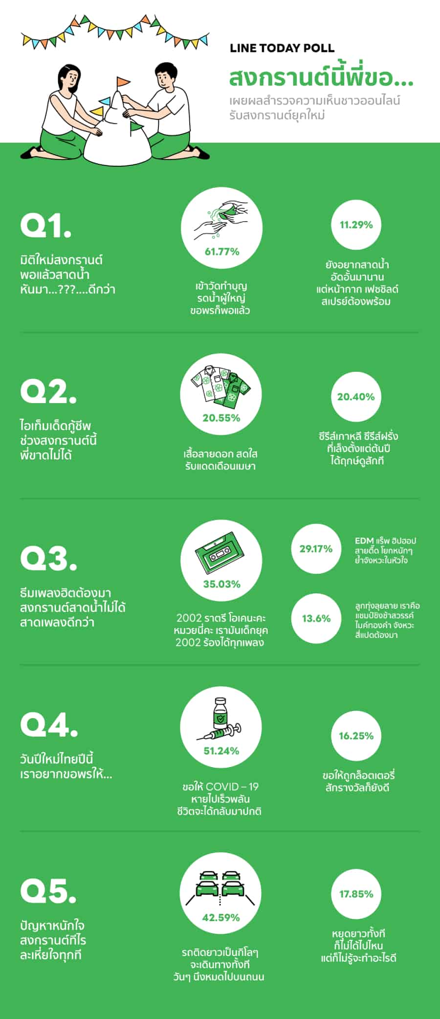 LINE TODAY POLL (ไลน์ ทูเดย์ โพล) เลยขอเปิด 5 โพลสำรวจความเห็นมหาชนออนไลน์จากกว่า 45,000 คนถึงสงกรานต์วิถีใหม่ 2564 ว่าพวกเขาคิดเห็นและมีแผนจะทำอะไรกันบ้าง (สำรวจระหว่างวันที่ 21 – 25 มีนาคม 2564)