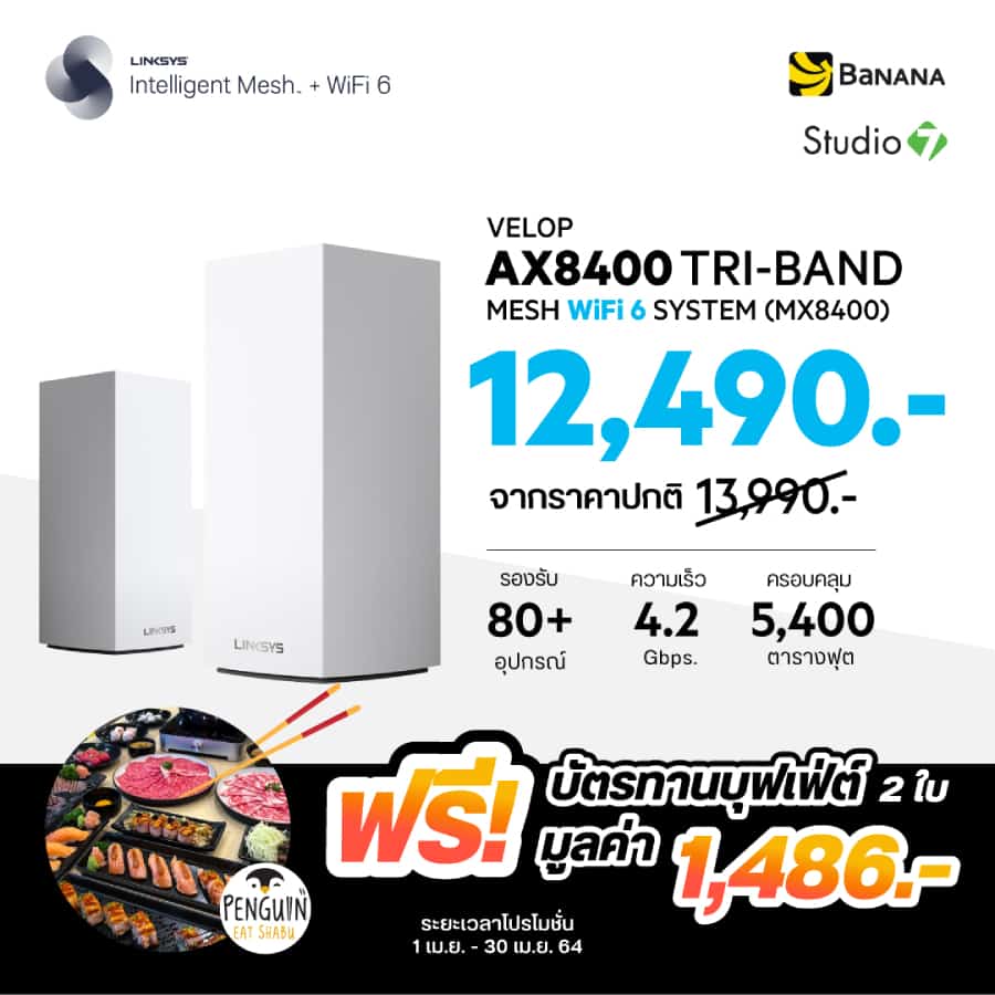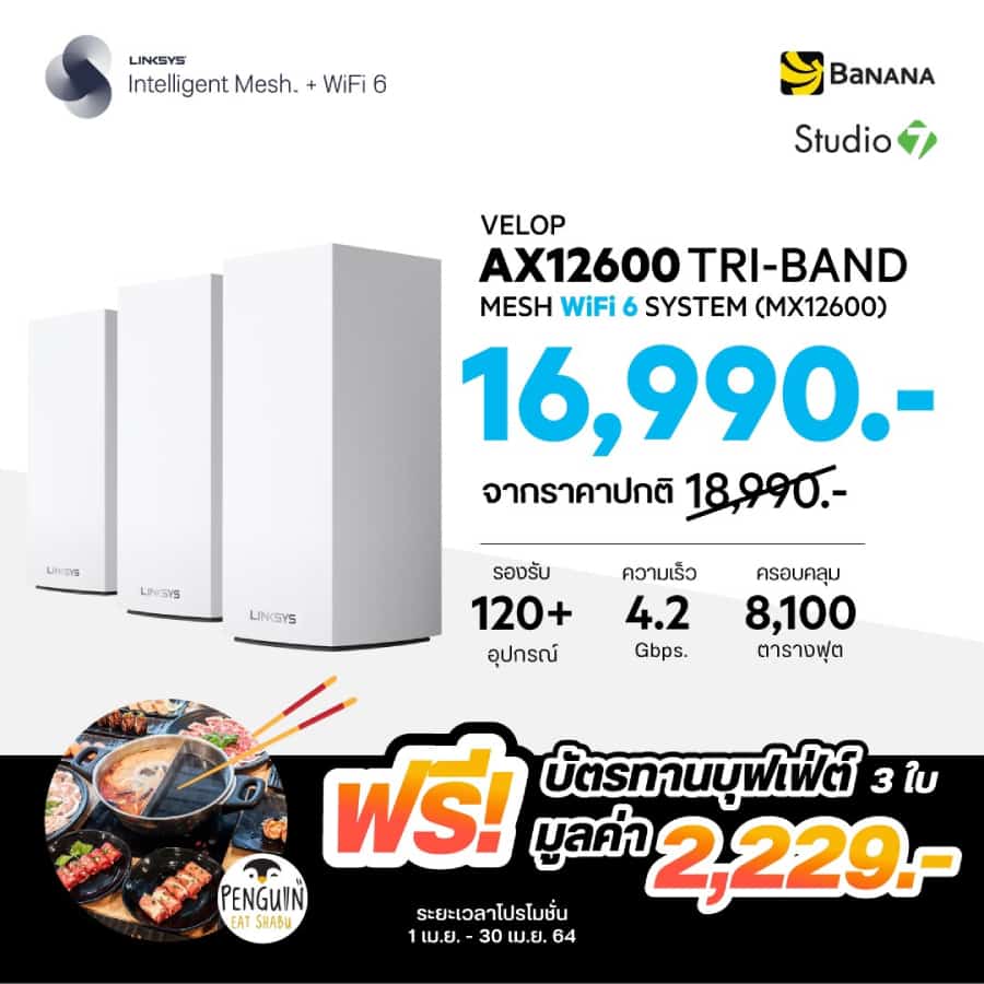 - Linksys Velop MX12600 ราคาพิเศษ 16,990 บาท จากราคาปกติ 18,990 บาท รับฟรี!! บัตรทานบุฟเฟ่ต์ชาบูพรีเมี่ยมน้องกวิ้น 3 ใบ มูลค่า 2,229 บาท