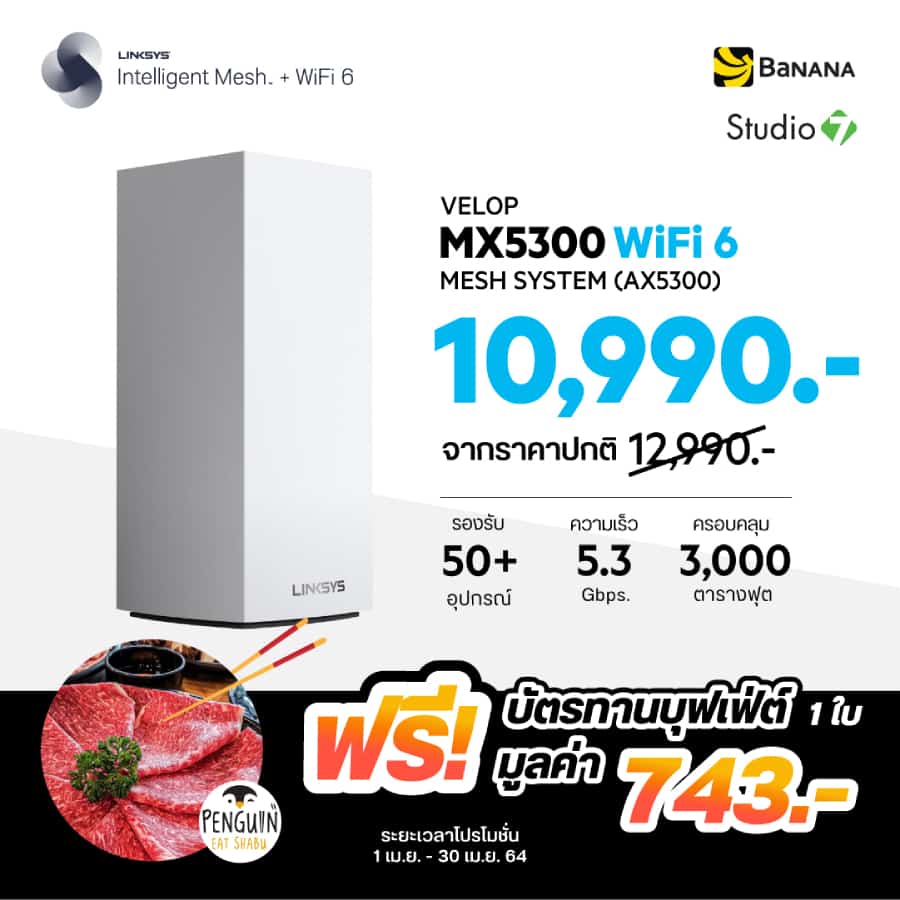 - Linksys Velop MX5300 ราคาพิเศษ 10,990 บาท จากราคาปกติ 12,990 บาท รับฟรี!! บัตรทานบุฟเฟ่ต์ชาบูพรีเมี่ยมน้องกวิ้น 1 ใบ มูลค่า 743 บาท