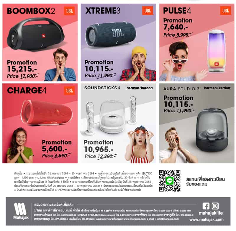 บริษัท มหาจักรดีเวลอปเมนท์ จำกัด จัดโปรโมชั่น SURPRISE SALE ลดถึงใจกับสินค้าลำโพงขายดีรุ่นใหม่ ทั้ง JBL และ HARMAN KARDON ลดราคา 15% (เฉพาะรุ่นที่ร่วมรายการ) พร้อมรับฟรี!! JBL T450 (มูลค่า 1,490 บาท) 1 ใบเสร็จ ต่อ 1 สิทธิ์