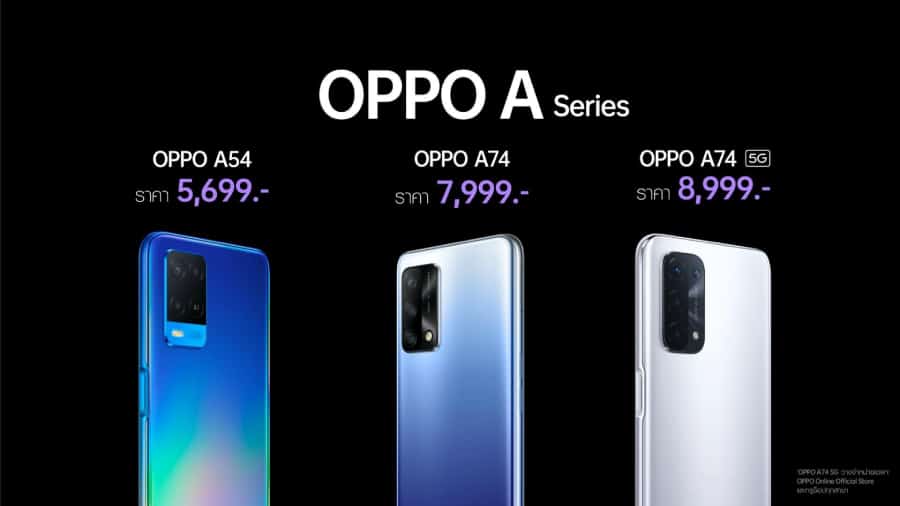 พร้อมสมาร์ทโฟน OPPO A Series อีก 3 รุ่นล่าสุด OPPO A74 โดยวางจำหน่ายแล้ววันนี้ ในราคา 7,999 บาท ที่ OPPO Brand Shop ทุกสาขาและตัวแทนจำหน่ายทั่วประเทศ รวมถึง OPPO A74 5G ที่มาในราคา 8,999 บาท สามารถเป็นเจ้าของได้แล้ววันนี้ผ่านช่องทาง OPPO Online Official Store บน Shopee, Lazada, JD Central, Thisshop, Online OPPO และทรูช็อปทุกสาขา