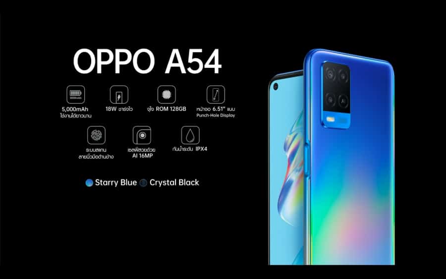 OPPO A54 มอบความสนุกและความบันเทิงเพลิดเพลินได้ตลอดทั้งวันด้วยแบตเตอรี่ขนาดใหญ่ถึง 5,000 mAh และเทคโนโลยีชาร์จไว 18W Fast Charge โดยสามารถชาร์จแบตเตอรี่ได้ 70% ภายใน 60 นาที พร้อมมอบพื้นที่จัดเก็บแบบจุใจด้วย ROM 128GB รวมถึงมีดีไซน์บางเบา จับถือได้อย่างถนัดมือ โดย OPPO A54 ให้เลือก 2 สี คือ สีน้ำเงิน Starry Blue และ สีดำ Crystal Black วางจำหน่ายอย่างเป็นทางการในวันที่ 24 เมษายน 2564 ในราคาเพียง 5,699 บาท เท่านั้น!