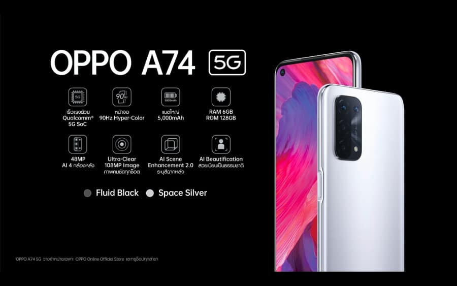 และสนุกไปกับความบันเทิงได้อย่างเต็มอิ่มด้วยหน้าจอ 90Hz Hyper-color display FHD+ ขนาด 6.49 นิ้ว ให้ภาพที่มีสีสันสมจริง นุ่มนวล และตอบสนองได้อย่างรวดเร็ว พร้อมด้วย AI 4 กล้องหลัง ความละเอียดสูงสุด 48MP และกล้องหน้าความละเอียด 16MP โดย OPPO A74 5G มีให้เลือก 2 สี คือ สีเงิน Space Silver และสีดำ Fluid Black วางจำหน่ายแล้ว ในราคา 8,999 บาท ที่ช่องทางออนไลน์ OPPO Online Official Store บน Shopee, Lazada, JD Central, Thisshop, Online OPPO และทรูช็อปทุกสาขา