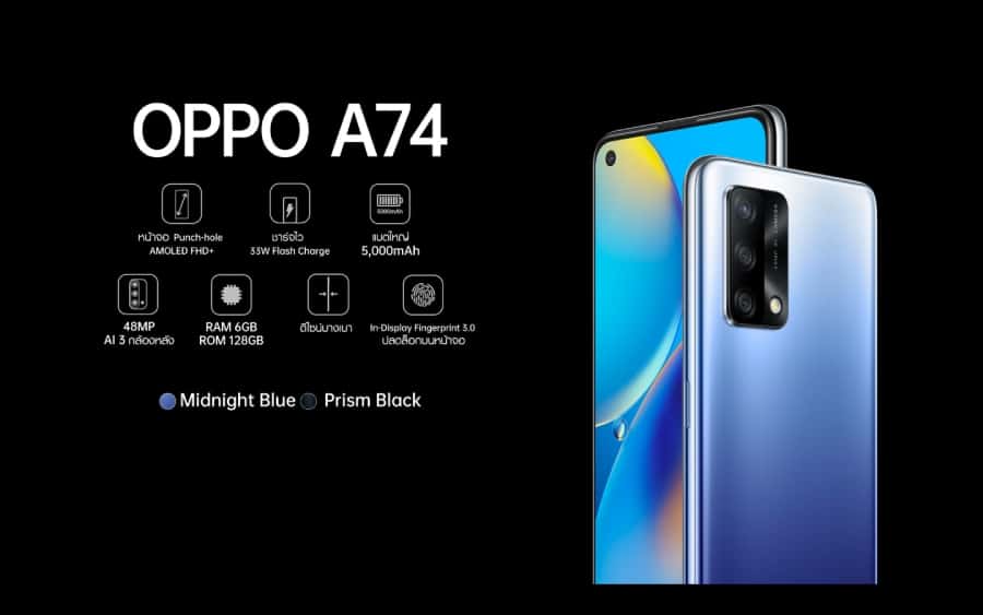 OPPO A74 ให้คุณเพลิดเพลินไปกับความบันเทิงทุกรูปแบบบนหน้าจอ Punch-hole AMOLED FHD+ ขนาด 6.43 นิ้ว พร้อมใช้งานได้ตลอดวันด้วยแบตเตอรี่ขนาดใหญ่ถึง 5,000 mAh และเทคโนโลยีชาร์จไว 33W Flash Charge อีกทั้งยังพร้อมมอบความสนุกในทุกการถ่ายภาพและวิดีโอด้วย AI 3 กล้องหลัง ความละเอียดสูงสุด 48MP และกล้องหน้าความละเอียด 16MP โดย OPPO A74 มีให้เลือก 2 สี คือ สีน้ำเงิน Midnight Blue และ สีดำ Prism Black วางจำหน่ายแล้วในราคา 7,999 บาท