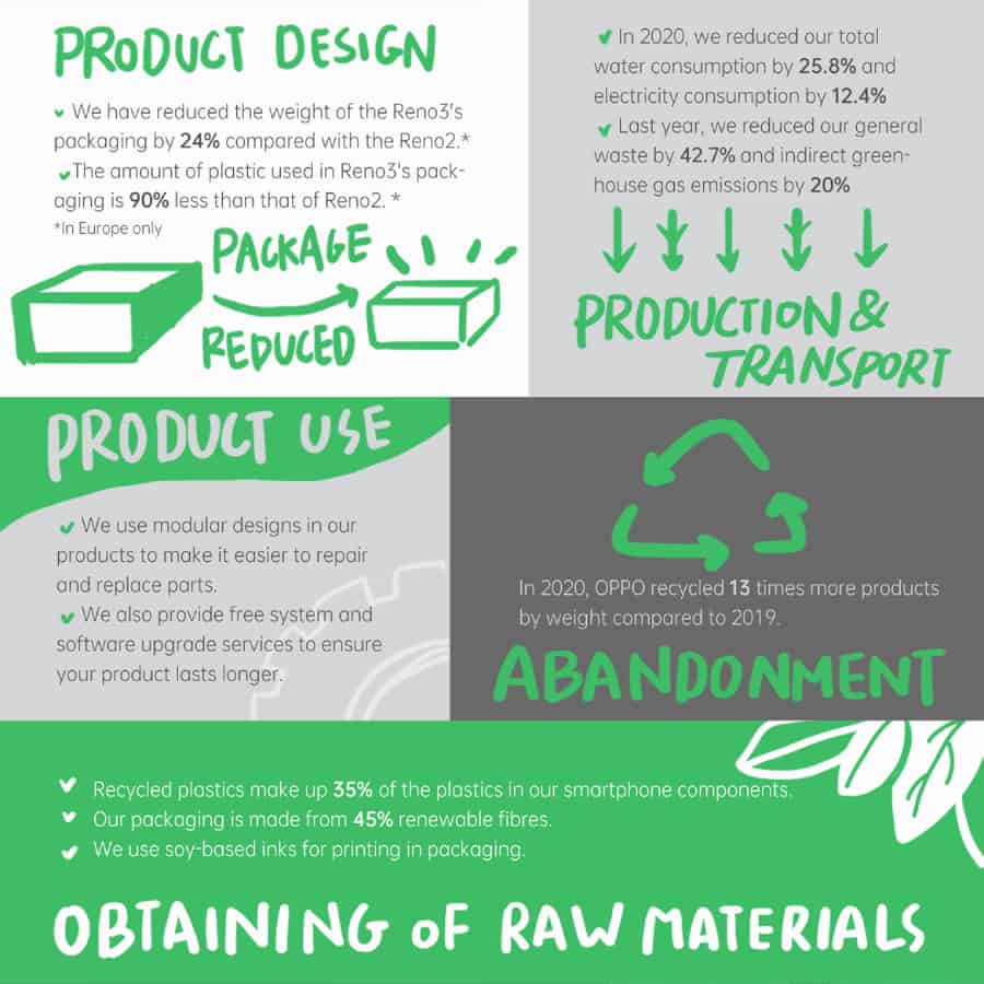 จากการเป็นส่วนหนึ่งของ circular economy หรือ เศรษฐกิจหมุนเวียน ทำให้ OPPO มีการรีไซเคิลผลิตภัณฑ์ที่เพิ่มขึ้นถึง 13 เท่าในปี 2563 เมื่อเทียบโดยน้ำหนักกับปี 2562 รวมถึงการมุ่งมั่นสนับสนุนการใช้วัสดุหมุนเวียนมากขึ้นด้วยการใช้พลาสติกแบบรีไซเคิล 35% ของวัสดุพลาสติกที่มีอยู่ในส่วนประกอบของสมาร์ทโฟน พร้อมกันนั้น บริษัทยังสามารถลดขยะทั่วไปได้ 42.7% และลดการปล่อยก๊าซเรือนกระจกทางอ้อมได้ 20% ในปี 2563