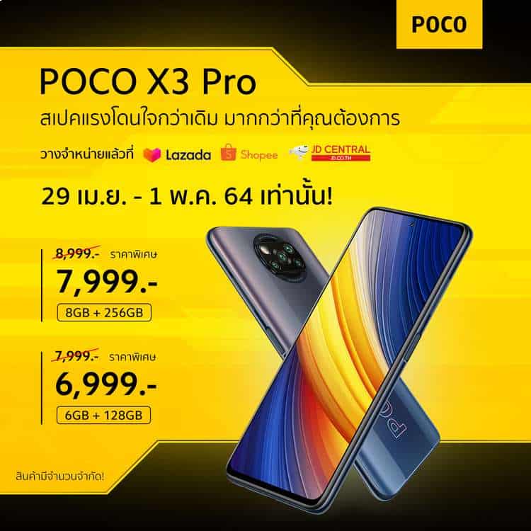 - POCO X3 Pro รุ่นความจุ 6GB+128GB ราคาเพียง เพียง 6,999 บาท จากราคาเต็ม 7,999 บาท