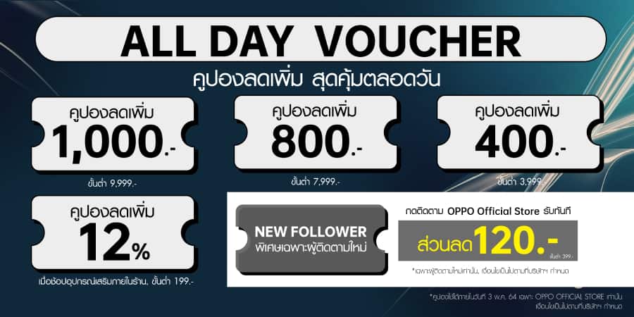 - Follow us! Voucher คูปองพิเศษเมื่อติดตาม OPPO Official Store ตั้งแต่วันที่ 27 เมษายน 2564 รับฟรี! คูปองส่วนลด 120 บาท เมื่อซื้อขั้นต่ำ 399 บาท โดยสามารถใช้คูปองได้เฉพาะวันที่ 3 พฤษภาคม 2564 เท่านั้น