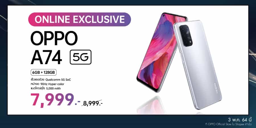 - เมื่อซื้อ OPPO A74 5G แลกซื้อ OPPO Enco Free ในราคาพิเศษเพียง 999 บาท จากปกติ 2,499 บาท โดยสิทธิแลกซื้อมีจำนวนจำกัด