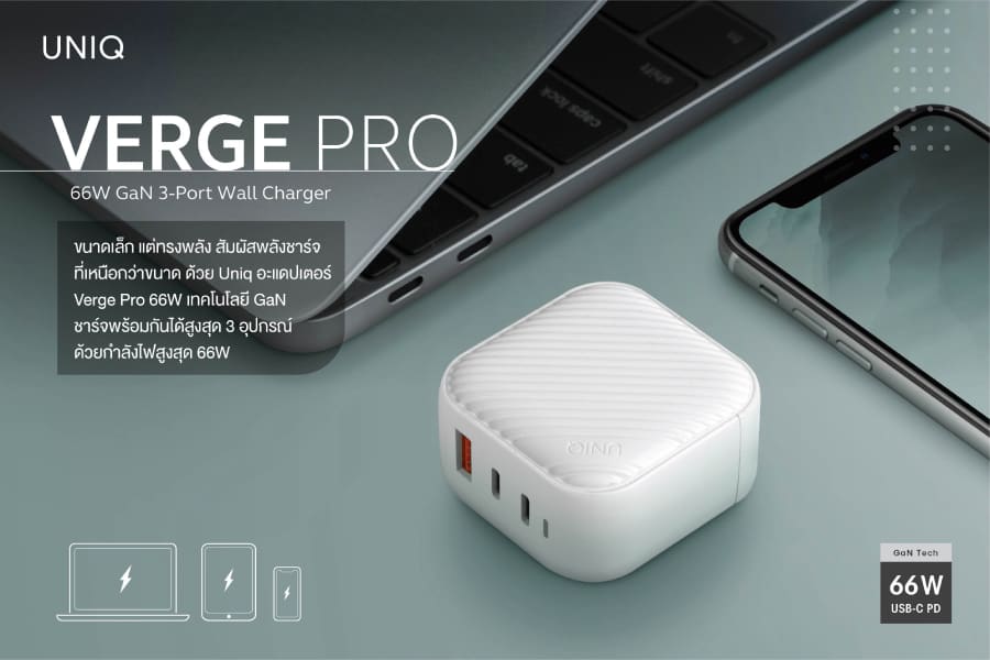 ในขณะเดียวกันอะแดปเตอร์ Uniq รุ่น Verge Pro 66W จะให้ความเร็วในการชาร์จขึ้นอยู่กับกำลังไฟทั้งหมดของเครื่องชาร์จ หากเครื่องชาร์จให้พลังงานมากเกินกว่าที่อุปกรณ์จะรองรับ พลังงานที่จ่ายออกมาจะถูกลดลงโดยอัตโนมัติเพื่อไม่ให้เกิดความเสียหายต่ออุปกรณ์ของคุณแต่อย่างใด โดยอะแดปเตอร์ รุ่น Verge Pro 66W มีให้เลือก 1 สี คือ สีขาว วางจำหน่ายแล้ววันนี้ในราคา 1,990 บาท