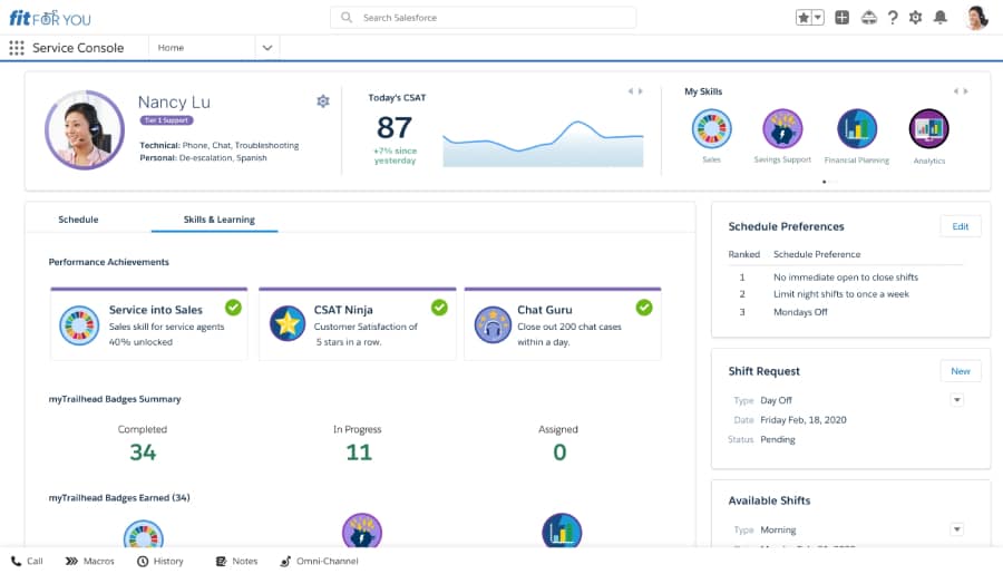 Service Cloud Workforce Engagement คือเครื่องมือสำหรับวางแผนจัดสรรพนักงาน โดยใช้ AI เข้ามาเป็นตัวช่วย โดย AI จะทำหน้าที่คาดคะเนจำนวนคำขอรับบริการที่จะเข้ามาที่ contact center ทางโทรศัพท์ อีเมล์ เว็บแชท ข้อความ SMS หรือโซเชียลต่าง ๆ เพื่อที่หัวหน้าทีมจะสามารถจัดสรรจำนวนพนักงานเพื่อให้บริการลูกค้าได้อย่างเหมาะสม อีกทั้งยังสามารถจับคู่พนักงานเข้ากับงานที่เหมาะสมกับทักษะ ความพร้อมให้บริการ และเวลาเข้างานที่ต้องการของพนักงาน นอกจากนี้ พนักงานบริการจะได้รับพื้นที่ทำงานที่รวบรวมข้อมูลการฝึกสอนแบบเรียลไทม์และการฝึกสอนที่พวกเขาต้องการไว้บนแพลตฟอร์มเดียวกัน ซึ่งใช้งานจากที่ไหนก็ได้ผ่าน myTrailhead ซึ่งเป็นแพลตฟอร์มการเรียนรู้ออนไลน์ครบวงจรที่เชื่อมต่อกับ Service Cloud