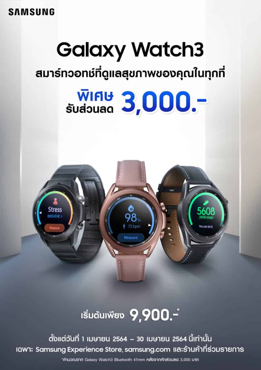 ด้วยฟังก์ชั่นในการเป็นผู้ช่วยส่วนตัวทั้งเรื่องสุขภาพและเรื่องงาน พร้อมความสามารถใหม่ อย่างการวัดออกซิเจนในกระแสเลือด (SpO2) ที่ช่วยบอกว่าปอดของคุณมีประสิทธิภาพขนาดไหน และไม่ใช่เพียงความสามารถใหม่เท่านั้น Samsung Galaxy Watch3 ทุกรุ่นยังมาพร้อมกับราคาใหม่ เริ่มต้นที่ 9,900 บาท (รุ่น 41mm/Bluetooth) ตลอดเดือนเมษายนนี้ เฉพาะที่ Samsung Experience Store, store.samsung.com และร้านค้าที่ร่วมรายการ หรือดูข้อมูลเพิ่มเติมได้ที่ https://www.samsung.com/th/watches/galaxy-watch/galaxy-watch3-41mm-mystic-bronze-sm-r850nzdaasa/