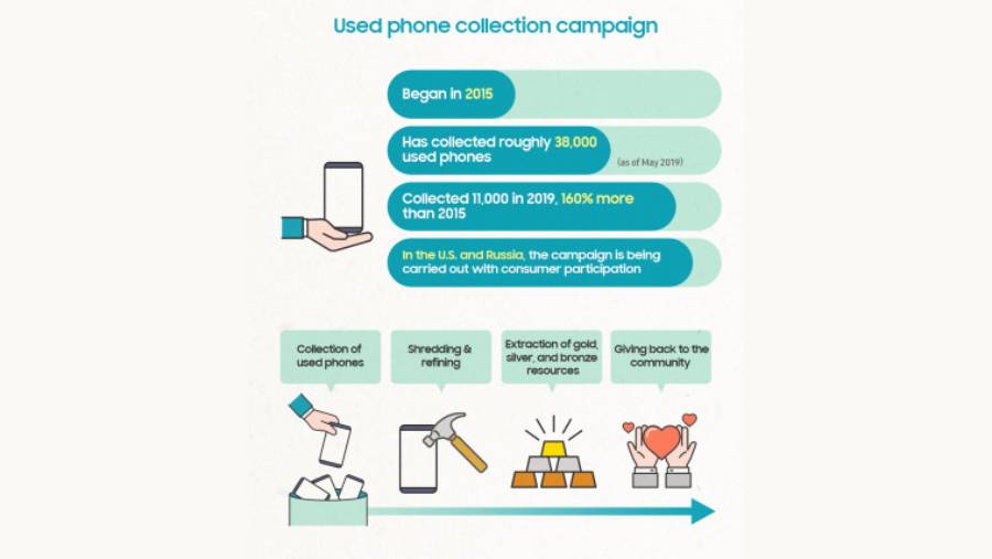 ในปี 2015 Samsung เปิดตัวโครงการรีไซเคิลสมาร์ทโฟนรุ่นเก่า แต่อินโฟกราฟิกล่าสุดที่บริษัทแชร์ เผยว่ามีการนำสมาร์ทโฟนรุ่นเก่ามา รีไซเคิล เพียงแค่ 38,000 เครื่อง นับตั้งแต่มีเริ่มโครงการจนถึงกลางปี 2019
