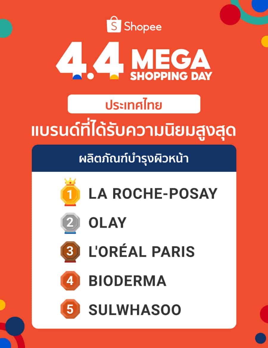 - ความงามและของใช้ส่วนตัว: นักช้อปชาวไทยยังคงให้ความสำคัญกับความสวยความงาม โดยในวันที่ 4 เดือน 4 พบว่าสินค้าประเภทผลิตภัณฑ์บำรุงผิวหน้าถูกขายออกไปมากกว่าครึ่งล้าน อาทิ มาส์กบำรุงผิวหน้า ทิชชู่ทำความสะอาดผิวหน้า ซึ่งถือเป็นสินค้าที่ได้รับความต้องการจากนักช้อปจำนวนมาก สำหรับแบรนด์ที่ได้รับความนิยมสูง ได้แก่ La Roche-Posay, L’Oreal Paris และ Olay