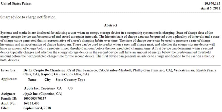 ปัญหาดังกล่าวน่าจะหมดไป เมื่อ Apple เผยสิทธิบัตรตัวใหม่ที่จะช่วยผู้ใช้งานแก้ไขปัญหาดังกล่าว ในอนาคต iPhone จะมีการแจ้งเตือนล่วงหน้าเมื่อแบตเตอรี่ของผู้ใช้เหลือน้อย โดยระบบจะแจ้งให้ทราบถึงเวลาที่เพียงพอที่ผู้ใช้สามารถใช้งานมือถือได้ สิทธิบัตรตัวนี้พัฒนาโดยนักประดิษฐ์ 4 คน ได้แก่ Gaurav Kapoor , Phillip Stanley-Marbell , Cyril De Chanterac และ Karthik Venkatraman โดย 2 คนหลังเคยฝากผลงานในสิทธิบัตรเรื่องการปรับปรุงการจัดการพลังงานในอุปกรณ์เอาไว้ก่อนหน้านี้
