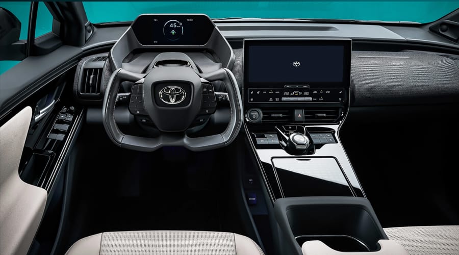 ห้องโดยสารดูกว้างขึ้นกว่าการออกแบบของรถในปัจจุบันของ Toyota ด้านพวงมาลัยของคนขับมีแผงหน้าจอขนาดเล็ก อีกทั้งยังมีหน้าจอขนาดใหญ่บริเวณตรงกลางคอนโซลของรถที่ใช้วัสดุหลักเป็นผ้า จากรูปจะสังเกตเห็นว่าพวกมาลัยนั้นมีรูปร่างที่แตกต่างจากพวงมาลัยปกติทั่วไป โดย bZ4X จะมาพร้อมกับเทคโนโลยี steer-by-wire ที่เป็นพวงมาลัยไฟฟ้าแบบไม่มีแกน Toyota พูดถึงเรื่องนี้ว่าการสอบเทียบของระบบ (calibration) จะทำให้ผู้ขับขี่ไม่จำเป็นต้องขยับมือไปรอบๆ พวงมาลัยในขณะเลี้ยวรถ เทคโนโลยีดังกล่าวจะเริ่มจำหน่ายในประเทศจีนก่อนแต่ Toyota ระบุว่ามีแผนจะเปิดตัวทั่วโลกด้วย