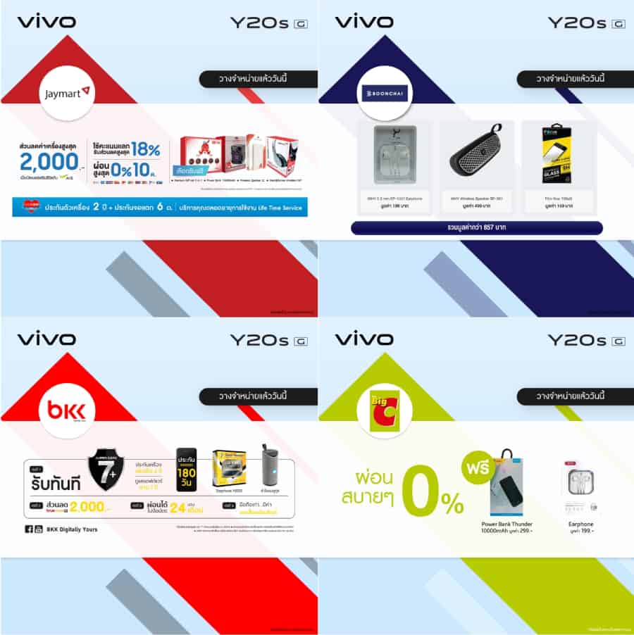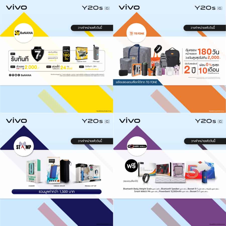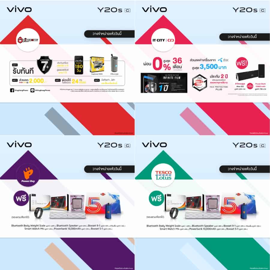 สามารถเป็นเจ้าของ Vivo Y20sG ได้แล้ววันนี้ที่ ราคา 5,999 บาท พบกับโปรโมชันพร้อมรับข้อเสนอสุดพิเศษจากร้านพาร์ตเนอร์ชั้นนำทั่วประเทศ ไม่ว่าจะเป็น Banana IT, IT CITY, CSC, TG FONE, Jaymart, Kingkong Phone, Power Buy, Big C, Tesco Lotus, Stamp, Power Mall, Boonchai และ BKK Digitally Yours ติดตามรายละเอียดเพิ่มเติมได้ที่ https://www.vivo.com/th/