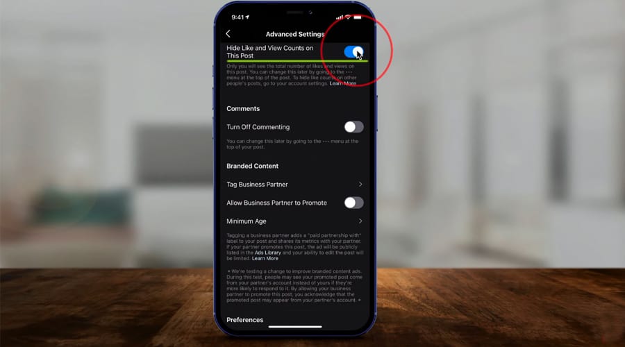 - เปิดสวิตช์ตัวเลือก ซ่อนยอดไลค์และยอดวิว (Hide Like and View Counts)