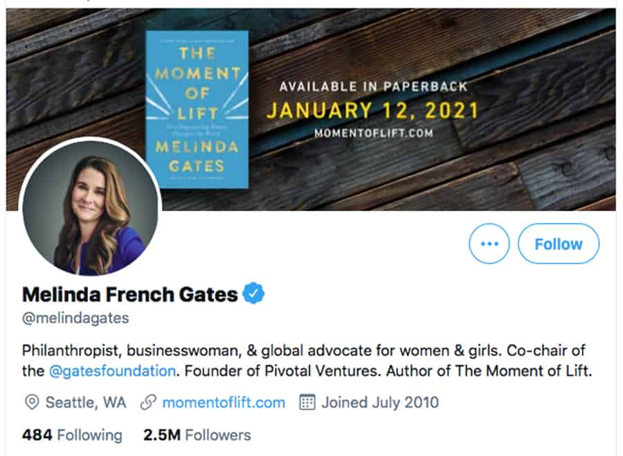 Forbes เสนอชื่อ Melinda Gates ให้เป็นสตรีที่ทรงอำนาจมากที่สุดคนหนึ่งในวงการการกุศล ทำให้เธออยู่ในอันดับ 5 ของ Power Women 2020 หลังจากมีการประกาศเรื่องการหย่าร้าง Melinda ได้เปลี่ยนชื่อในโปรไฟล์ทวิตเตอร์ของเธอเป็น Melinda French Gates โดยใช้นามสกุลเดิมของเธอเป็นชื่อกลาง (ชื่อเดิมก่อนแต่งงานของเธอ คือ Melinda Ann French)