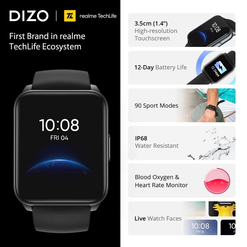 เริ่มจำหน่ายในวันที่ 1 มิถุนายน 2564 – DIZO แบรนด์แรกภายใต้ realme Techlife ecosystem เปิดตัวสมาร์ทวอทช์ “DIZO Watch” ในสไตล์สมาร์ท สปอร์ต““Smart Tech Life for Every Different You” สำหรับกีฬาที่ดีที่สุด พร้อมอายุแบตเตอร์รี่ยาวนาน ในราคาจำหน่ายต่ำกว่า 2,000 บาท พร้อมหน้าจอขนาด 3.5 ซม. ความละเอียด 320×320 ด้วยความสว่างมากกว่า 600 nits ที่ 30 FPS. ช่วยให้เห็นได้ง่ายแม้อยู่กลางแจ้งหรือในวันแดดจ้า อีกทั้งยังช่วยถนอมสายตาในคราวเดียวกัน รองรับการสัมผัสแบบเต็มหน้าจอ