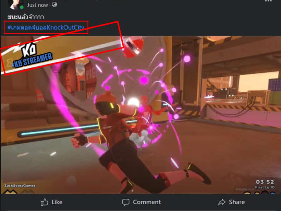 กติกา: เข้าร่วมกิจกรรมเล่นเกม Knockout City กับสตรีมเมอร์ในวันที่ 22-23 พฤษภาคม 2564 เวลา 19.00 น. หาห้องในโหมด Street Play เพื่อมองหาทีมของสตรีมเมอร์ ผู้เล่นต้อง KO สตรีมเมอร์คนใดคนหนึ่งและทำการแคปรูปเป็นหลักฐาน ผู้เล่นต้องโพสรูปดังกล่าวลงใน Facebook ของตัวเองและทำการตั้งสถานะโพสเป็น สาธารณะ (public) พร้อมติด #เกมดอดจ์บอลKnockOutCity ทางทีมงานจะสุ่มผู้โชคดี 30 ท่านและติดต่อไปเพื่อแจกเกม KNOCKOUT CITY ให้ท่านละ 1 รางวัลไปสนุกกันฟรีๆ !!