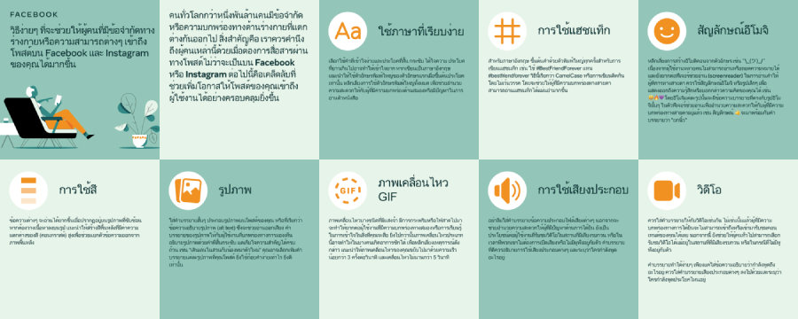 ในขณะที่ผู้คนยังใช้เวลาส่วนใหญ่อยู่กับบ้านเพื่อลดความเสี่ยง และเลือกที่จะใช้ช่องทางออนไลน์ในการเชื่อมต่อถึงกันนั้น การคำนึงถึงผู้พิการ หรือผู้ที่อาจมีข้อจำกัดในด้านต่างๆ ก่อนที่จะโพสต์เนื้อหาลงบน Facebook และ Instagram ก็เป็นสิ่งสำคัญ เราจึงขอนำเสนอเคล็ดลับดีๆ ที่จะทำให้โพสต์ของคุณนั้น เป็นโพสต์ที่ทุกคนสามารถเข้าถึง และเข้าใจได้