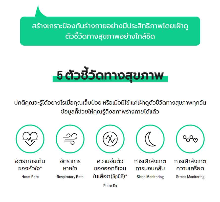 - การนอนหลับ (Sleep Monitoring) – ฟีเจอร์สำรวจคุณภาพการนอน ช่วยให้ปรับปรุงพฤติกรรมการนอนนำไปสู่การเพิ่มภูมิคุ้มกันที่แข็งแรง