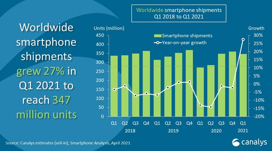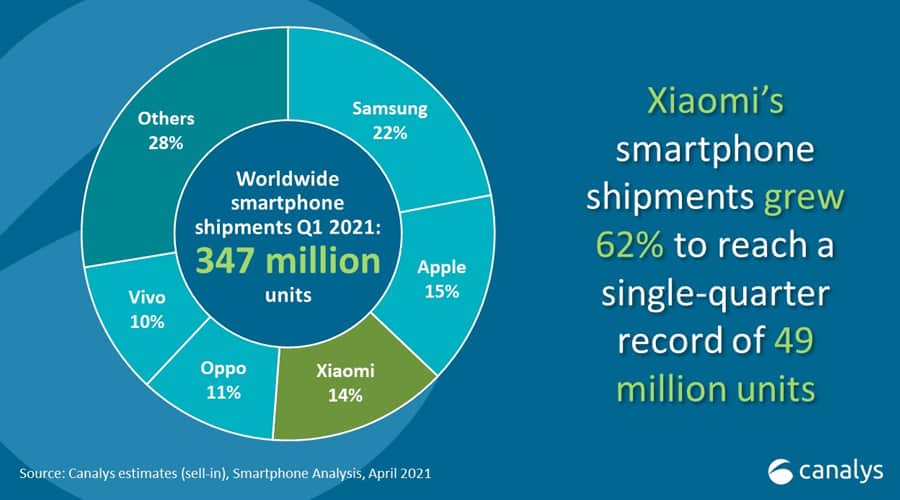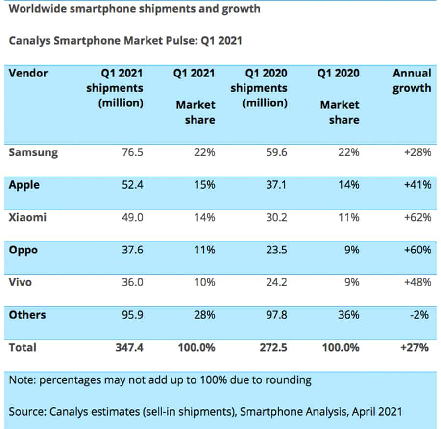 ยอดการจัดส่งสมาร์ทโฟนทั่วโลกสูงถึง 347 ล้านเครื่องในไตรมาสที่ 1 ปี 2021 เพิ่มขึ้นถึง 27% เมื่อเทียบรายปีกับปีที่ผ่านมา โดยมี Samsung นำมาเป็นที่หนึ่งมียอดส่งออกขาย 76.5 ล้านเครื่อง ได้ส่วนแบ่งการตลาดไป 22% และที่น่าจับตามองคือ Xiaomi ที่ทำผลงานได้ยอดเยื่ยมมากๆ แซงขึ้นมาอยู่อันดับที่ 3 และทำยอดห่างจากอันดับที่ 2 อย่าง Apple อีกแค่ไม่กี่ล้านเครื่องเท่านั้น