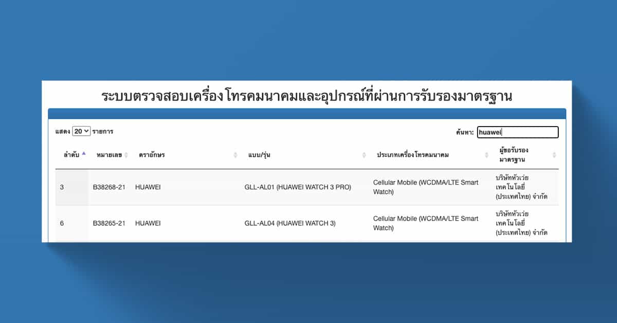 จากหน้า ระบบตรวจสอบเครื่องโทรคมนาคม และอุปกรณ์ที่ผ่านการรบรองมาตรฐาน ของทาง คณะกรรมการกิจการกระจายเสียง กิจการโทรทัศน์ และกิจการโทรคมนาคมแห่งชาติ หรือ กสทช. ได้มีรายชื่ออุปกรณ์ใหม่จากทางหัวเว่ย ปรากฎขึ้นมาในฐานข้อมูล 2 รุ่นด้วยกันคือ GLL-AL01 (HUAWEI Watch 3 Pro) และ GLL-AL04 (HUAWEI Watch 3)