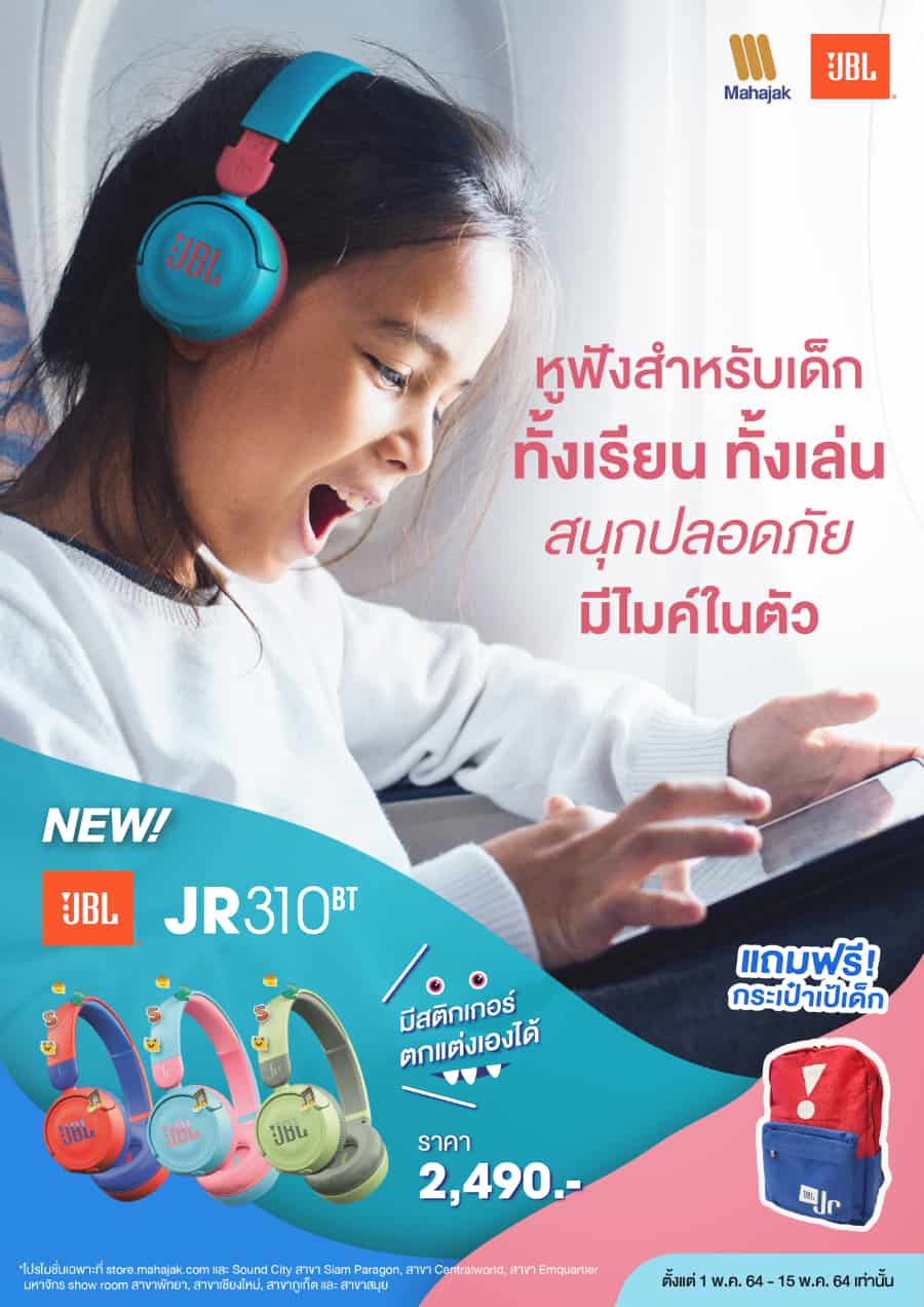Promotion สำหรับวันที่ 1 – 15 พฤษภาคม 2564 นี้ เมื่อซื้อ JBL JR 310BT รับฟรี!! กระเป๋าเป้สุดน่ารักจาก JBL JR 310BT มูลค่า 990 บาท *สินค้ามีจำนวนจำกัด