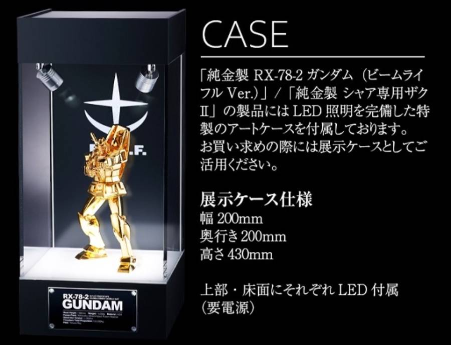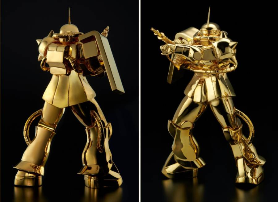 นอกจากนี้ยังมี Zaku II Char Custom ที่ทำจากทอง 24 กะรัต ความสูง 17.5 เซนติเมตร แต่มันมีน้ำหนักอยู่ที่ 1 กิโลกรัมเลยทีเดียว และแน่นอนว่าการที่มันทำจากทองคำแบบนี้ก็ต้องมาพร้อมราคาที่แพงหูฉี่